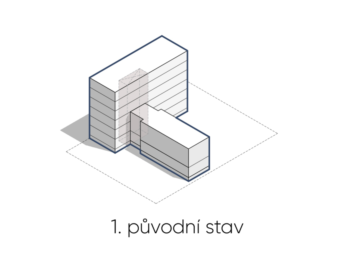 Původní budovu přirovnáváme k důstojné dámě, zpoza které vykukuje nová mladá slečna. Ta má sice respekt ke starší a zkušenější kolegyni, ale zároveň se s lehkou várkou drzosti dere na světlo s novou svěží energií.