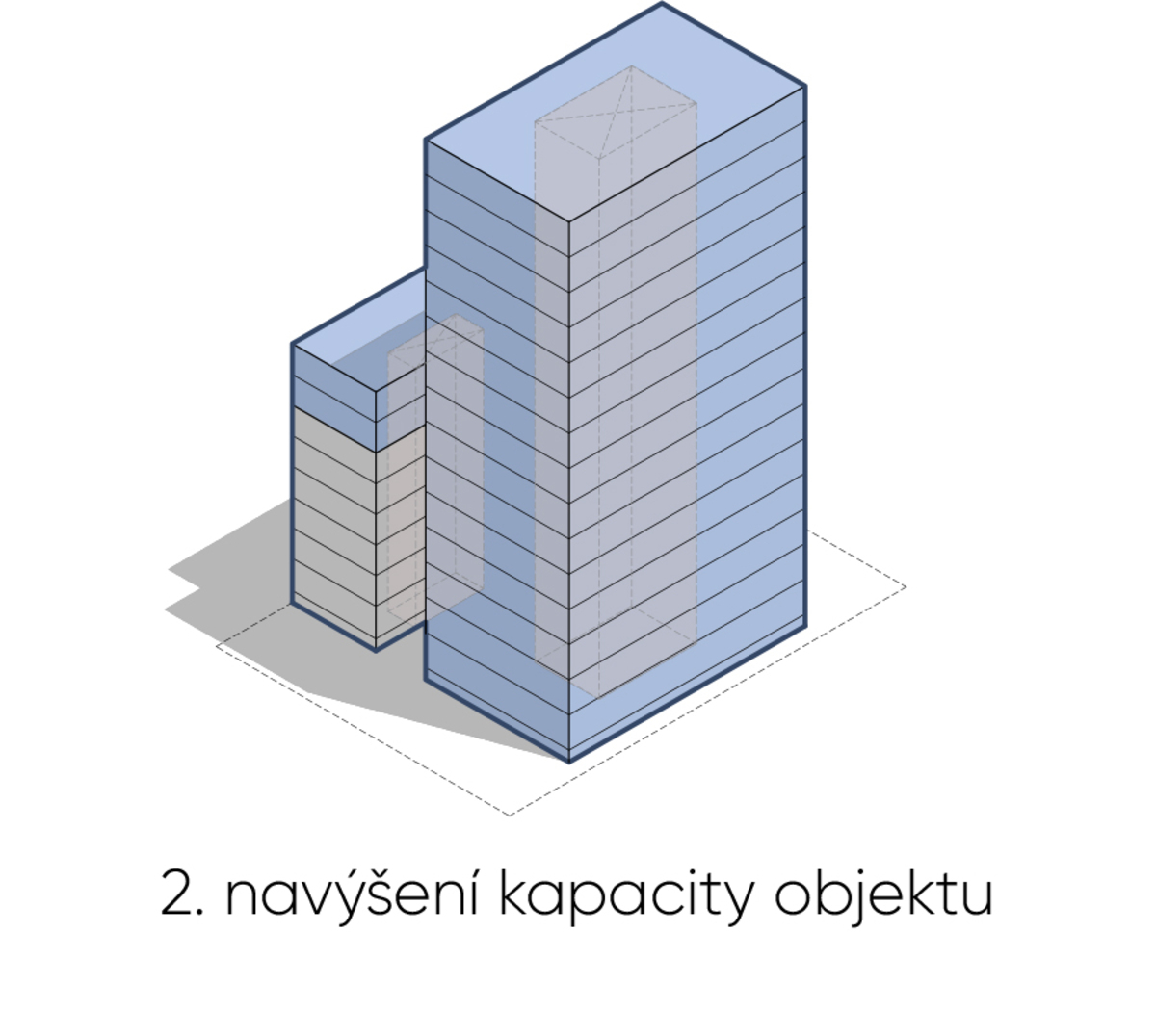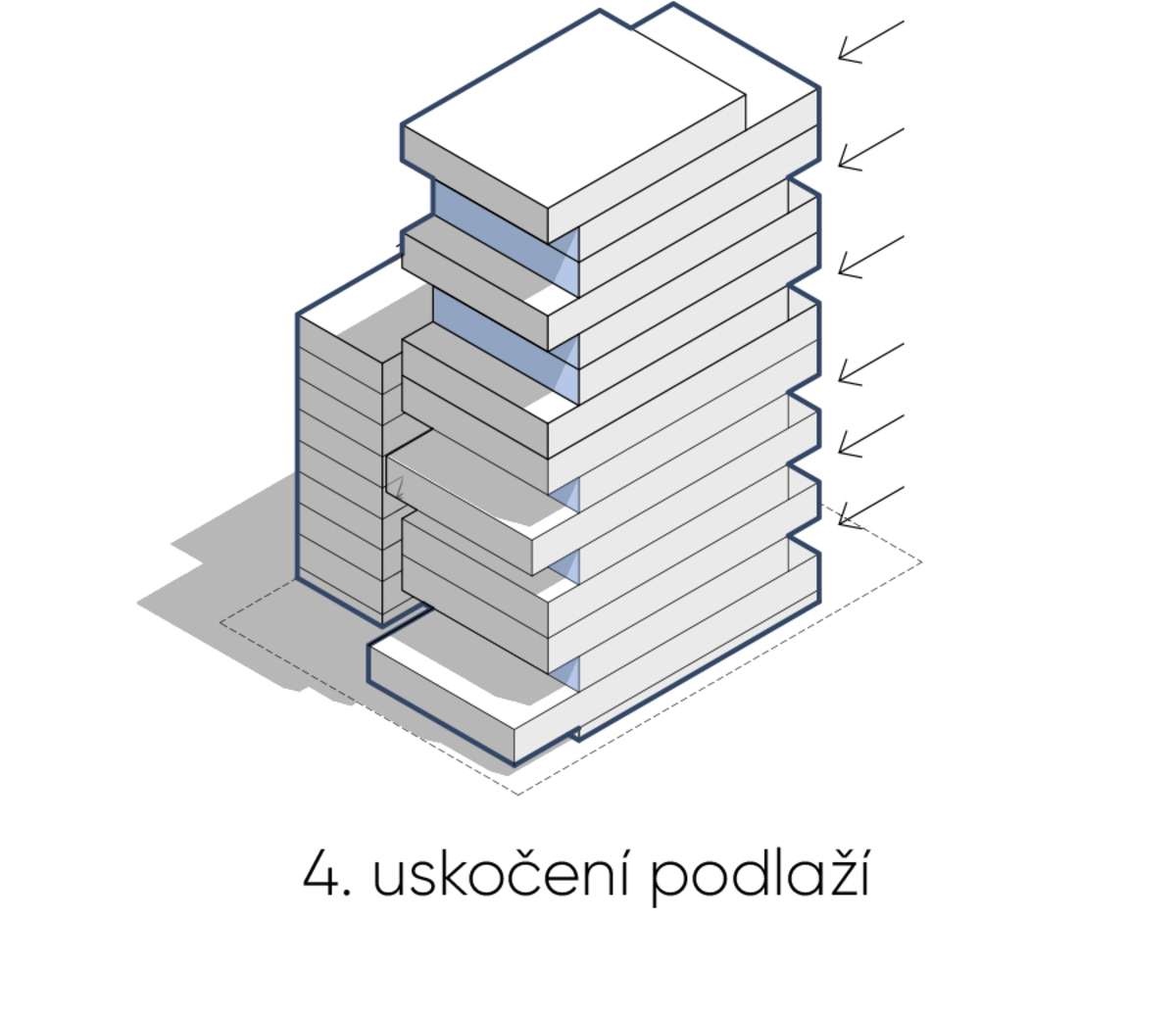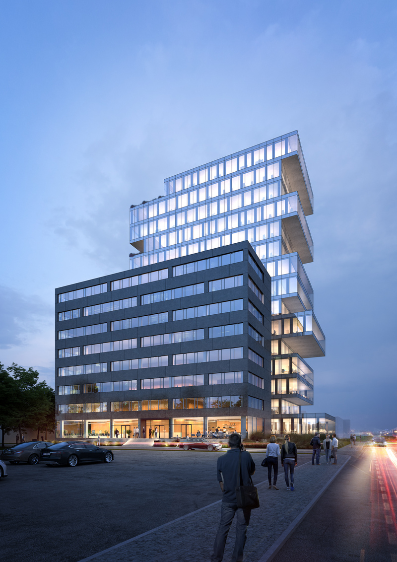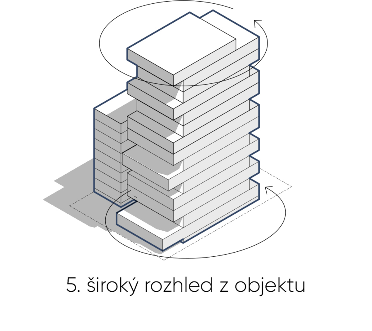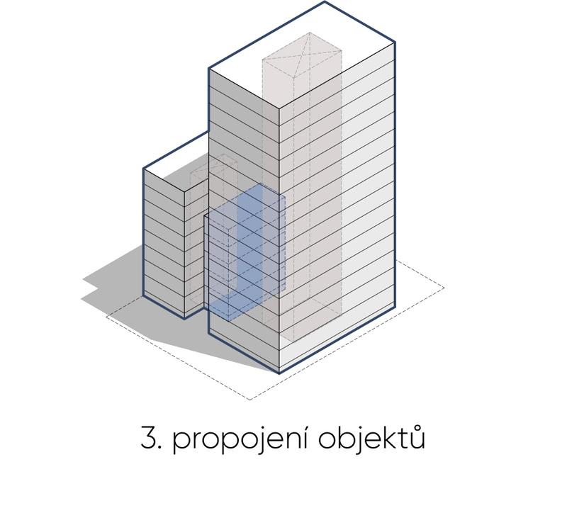 Sestava budov reaguje a plynule navazuje na živý veřejný prostor v okolí. Propojení obou věží krčkem zvětší pronajímatelnou plochu a také umožní jednotnou recepci, což nahrává ekonomickému aspektu projektu.