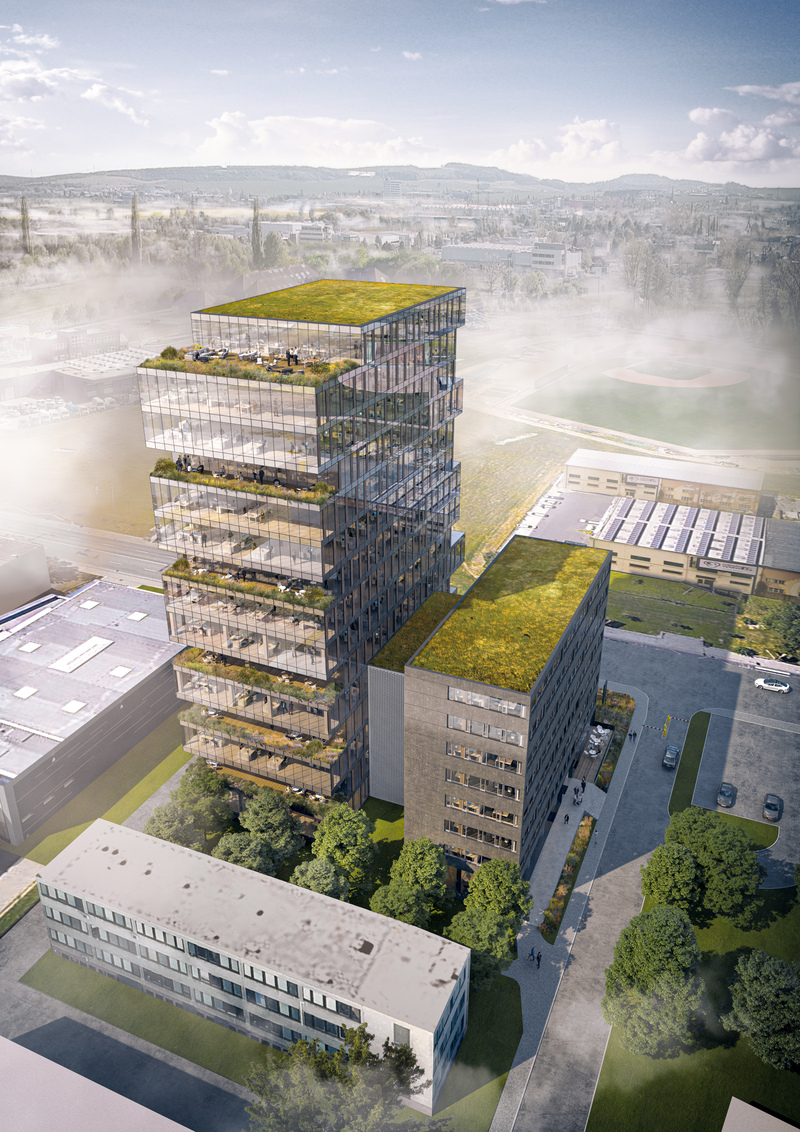 Klidná hmota původní budovy v kontrastu se vzdušnou věží přístavby utvářejí novou dominantu v blízkosti městské třídy na příjezdu do města Brna. Forma hlavního objemu, která vychází z rozměrů původního objektu, je rozehrána uskakujícími podlažími. Díky tomuto řešení navíc vznikají příjemné pobytové terasy pokryté vegetací s nádhernými výhledy na centrum Brna i oblast Pálavy.