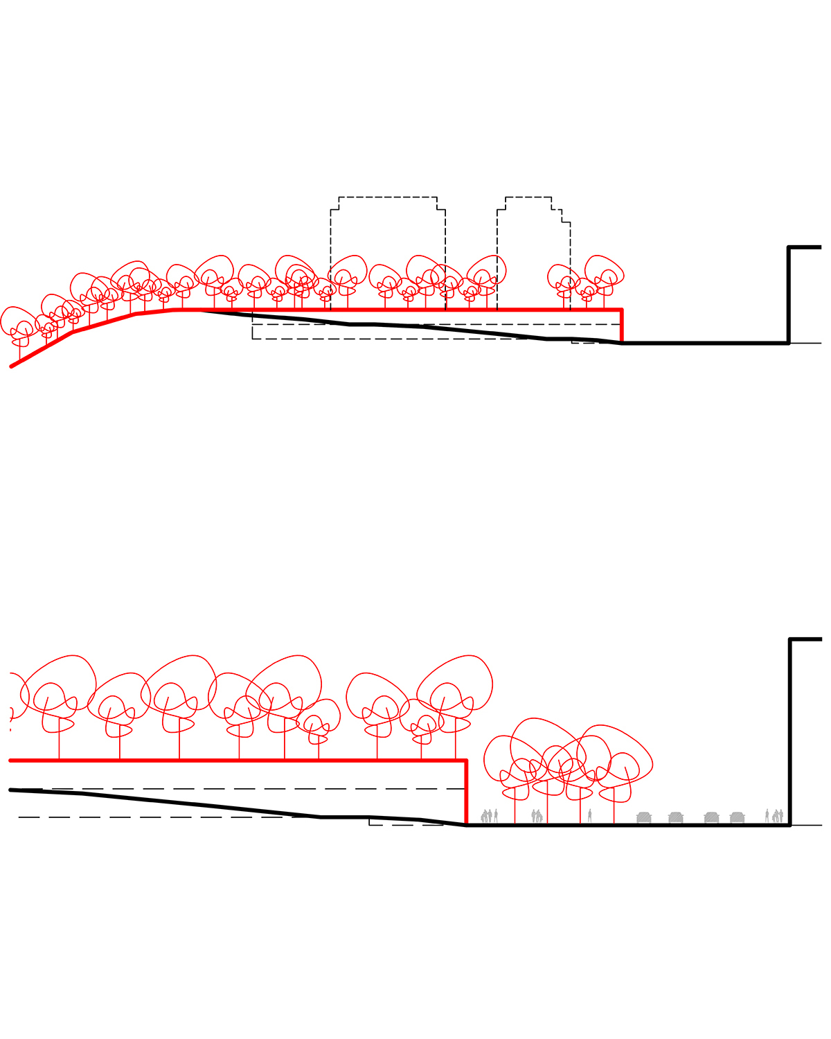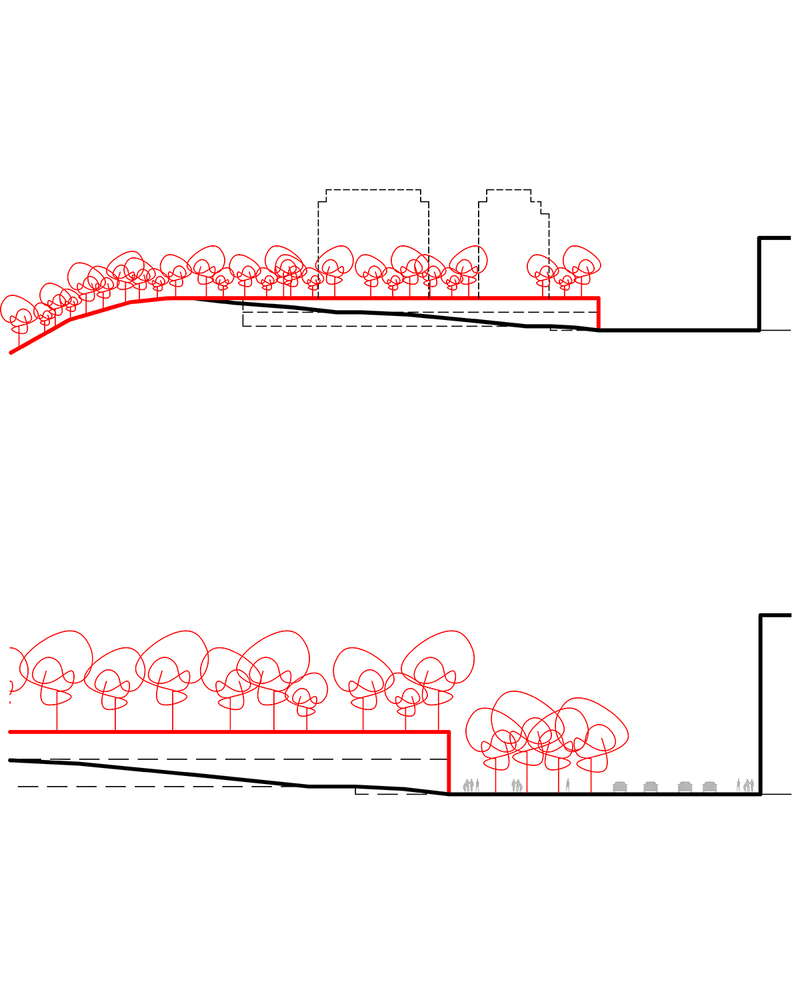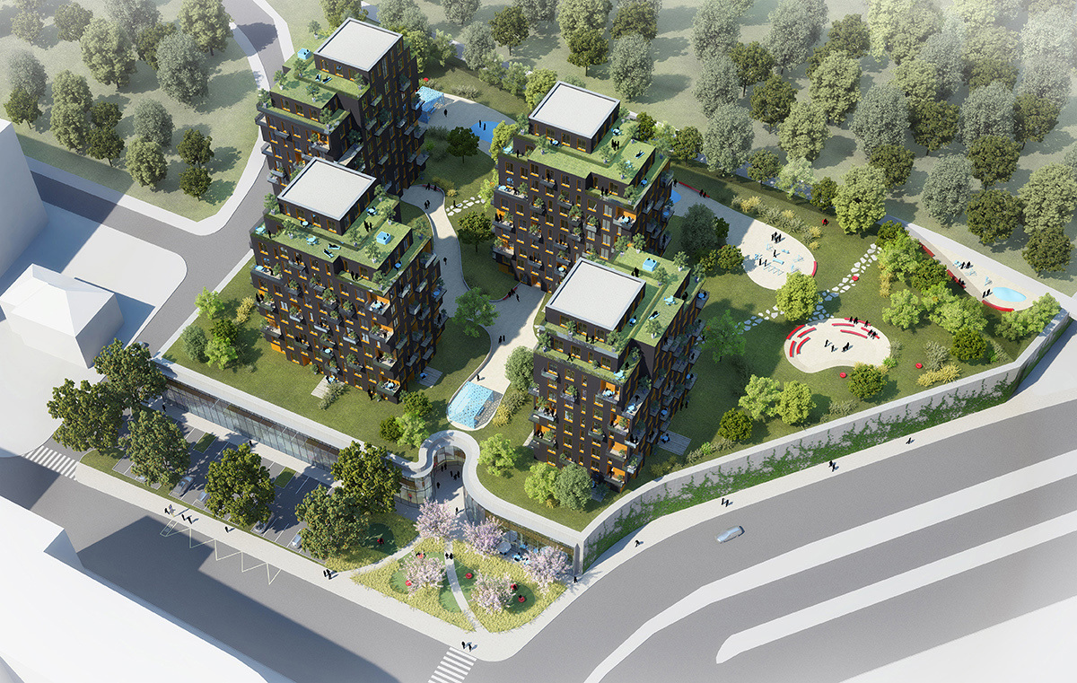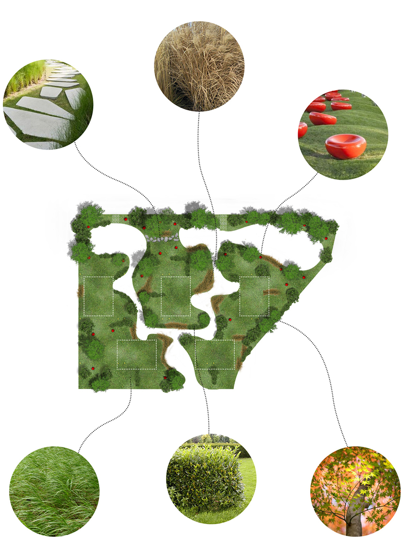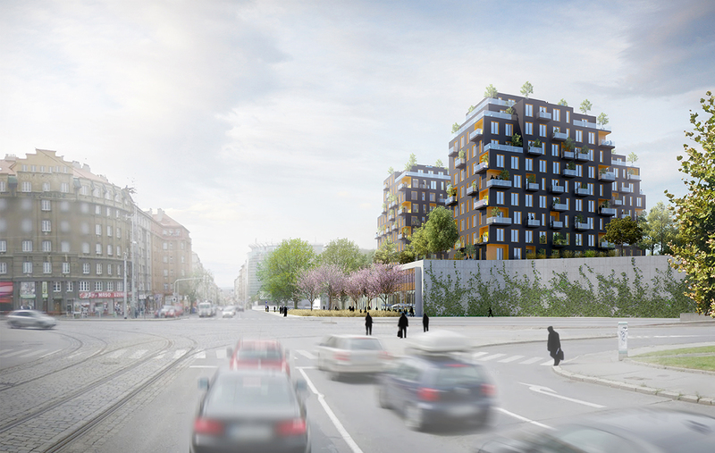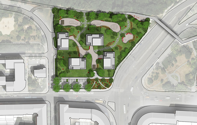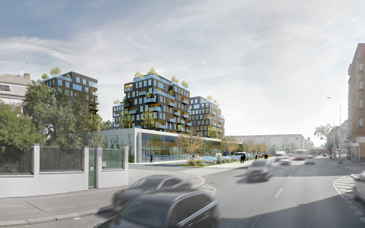 Koncept rezidence navazuje na místní reliéf terénu, který v severojižním směru prudce stoupá, dosahuje vrcholu v místě začátku stavebního pozemku a následně pozvolně klesá zhruba o výšku dvou podlaží k ulici. Navrhovaný objekt využívá těchto souvislostí a vytváří vodorovnou plochu v úrovni terénního vrcholu, pod nímž se ukrývá dvoupodlažní parkovací část, a směrem do ulice orientuje obchodní plochy posilující živý uliční parter. Vodorovná plocha, ze které vyrůstají bytové domy, svým bohatě vegetačním charakterem navazuje na park pokrývající terén v nejvyšším místě. Tímto řešením se obytné domy stávají součástí parku a spodní dvě podlaží součástí ulice.