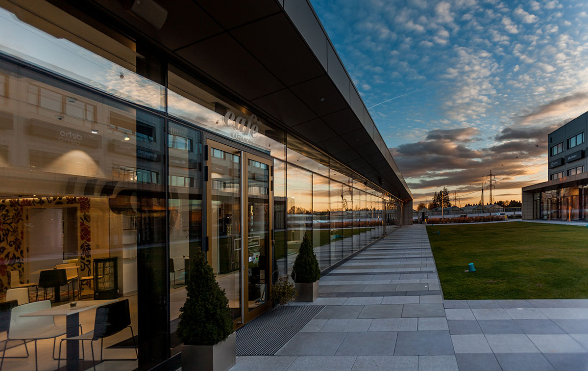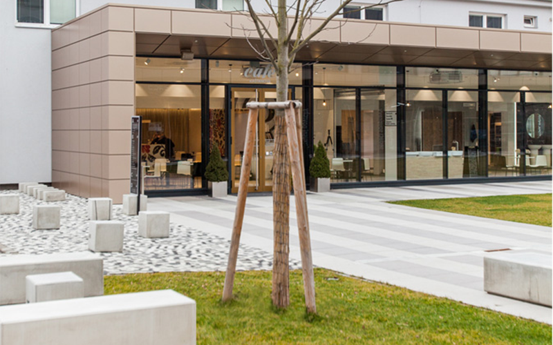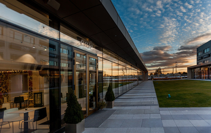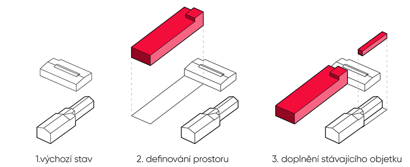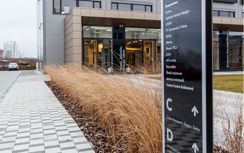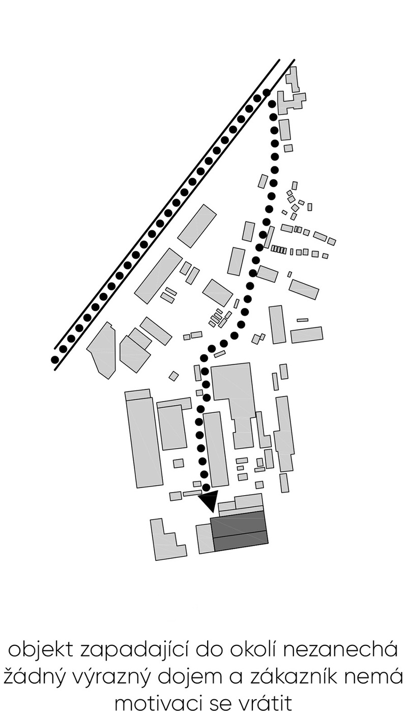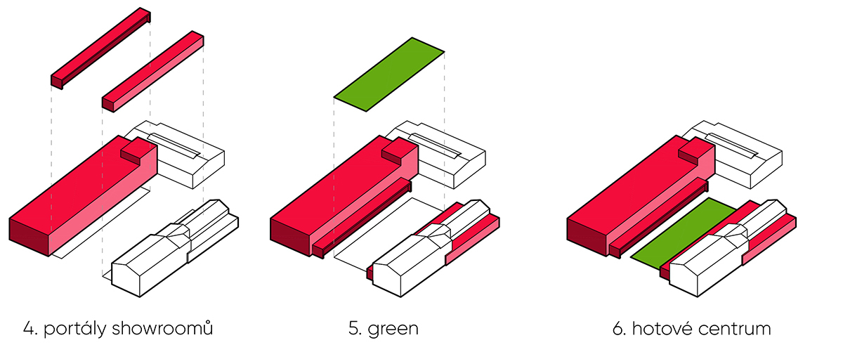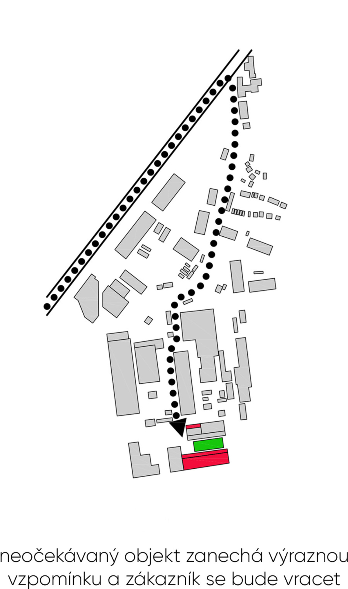 S vědomím těchto zákonitostí jsme uvažovali o vhodné podobě centra bydlení a designu. Místo se nachází na konci typického průmyslového areálu a centrum by vůbec nemělo šanci, kdyby se zde nezačalo odehrávat něco nečekaného a překvapivého. Představte si, že jedete úzkou komunikací, vjedete do průmyslového areálu bez jasně držené koncepce a v závěru naleznete dvě zlaté bedny, orientované skleněnými portály proti sobě a obsahující designové showroomy a příjemnou kavárnu. Mezi těmito portály se navíc rozprostírá perfektně střižený anglický trávník. Díky přechozímu zážitku z cesty areálem jste velmi mile překvapeni, možná až šokováni, protože toto byste zde opravdu nečekali.