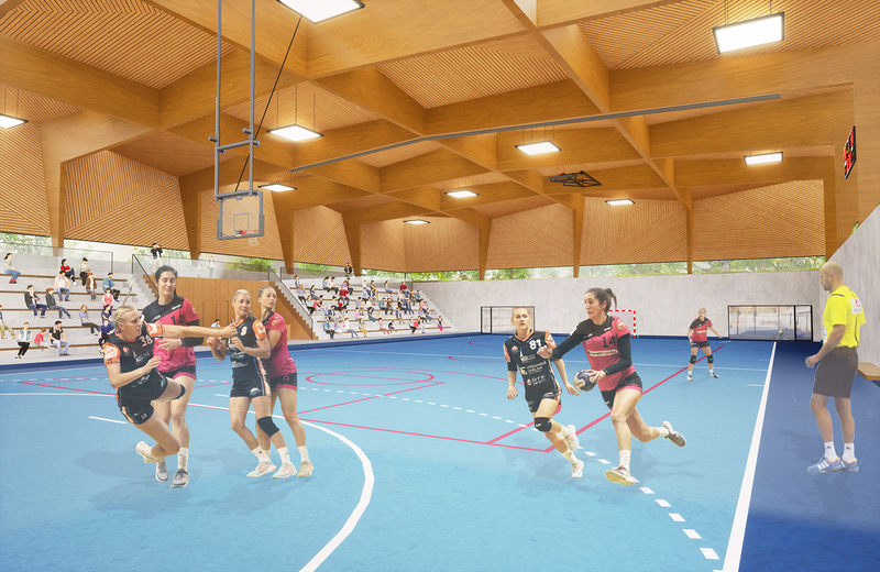 Umístění budovy umožňuje fanouškům vstupovat přes reprezentativní parkový předprostor, který je pojatý jako slavnostní plocha připomínající jedinečné úspěchy házenkářek.