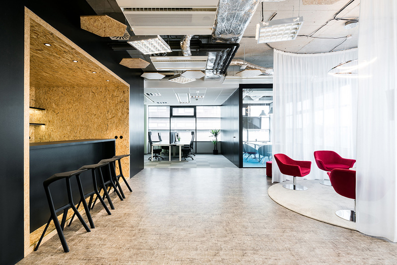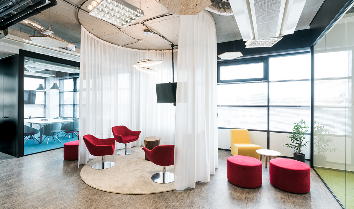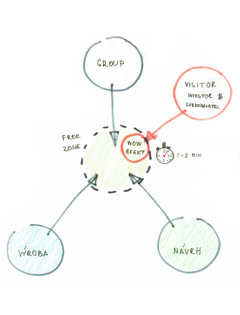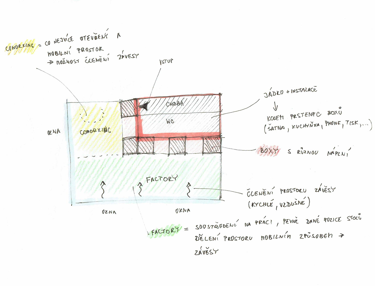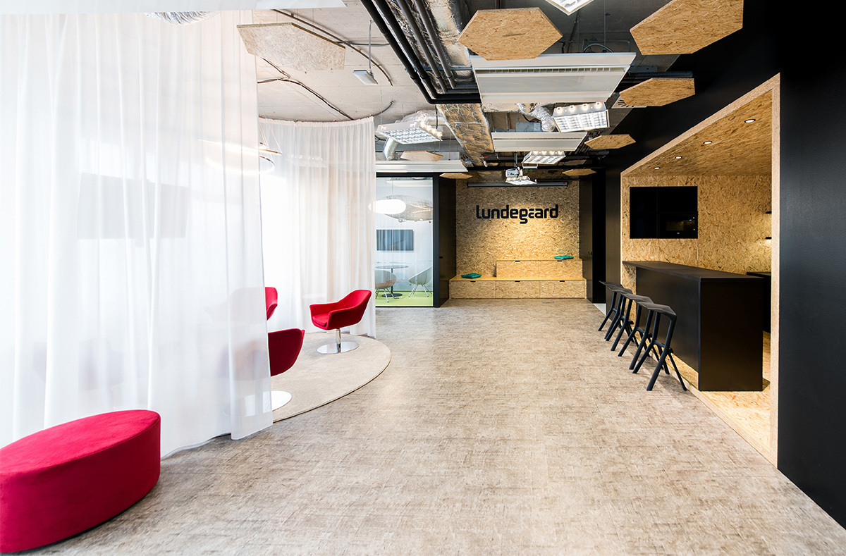 V mnoha oborech jsou pracovní týmy rozděleny primárně na dvě části: techniky a návrháře neboli racionalisty a poety. Stejně tak to sledujeme v naší práci: stavební inženýři a architekti. U našeho klienta z IT oboru tomu není jinak: blue team and green team. Spolu s klientem jsme ale přesvědčeni o tom, že perfektní produkt lze vytvořit pouze vzájemným prolínáním těchto dvou částí, nalezením správného poměru a spojením obou složek v jeden celek. Aby k tomuto mohlo dojít, je potřeba vytvořit prostor pro setkávání – coworking – garden – lundegaarden. Nejlépe využitelným prostorem je pro nás ověřený půdorysný tvar obdélníku, jelikož jakékoliv zakřivení v prostoru nám znemožňuje efektivní využití místnosti a vytváří podivné situace.