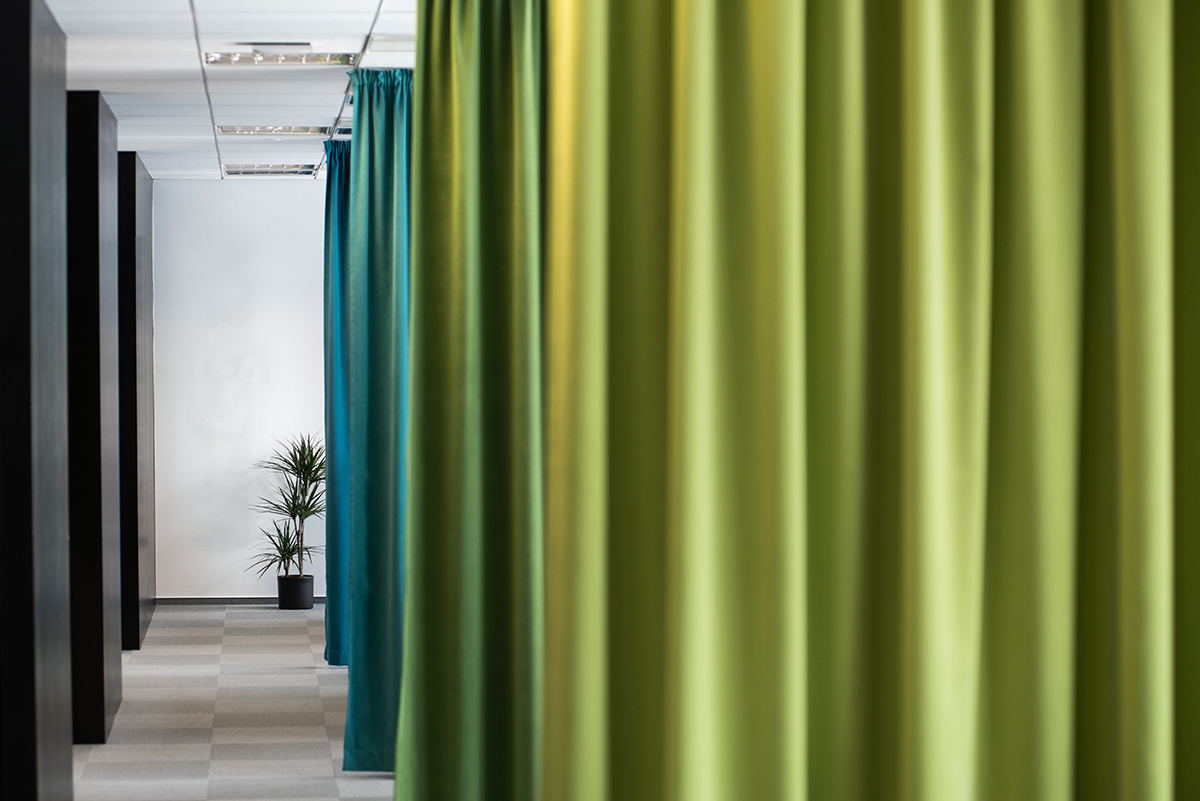 Na této realizaci jsme si nicméně prověřili, že určitá míra poetičnosti nebo neracionálního tvaru muže v čistě ortogonálním prostoru vyvolat příjemnou změnu, dynamiku a také překvapivě silné ovládnutí okolního prostoru. Toto působení jsme umocnili pomocí užití průhledné látky, jejíž měkkost kontrastuje s ostatními tvrdými materiály jako je sklo nebo beton.
