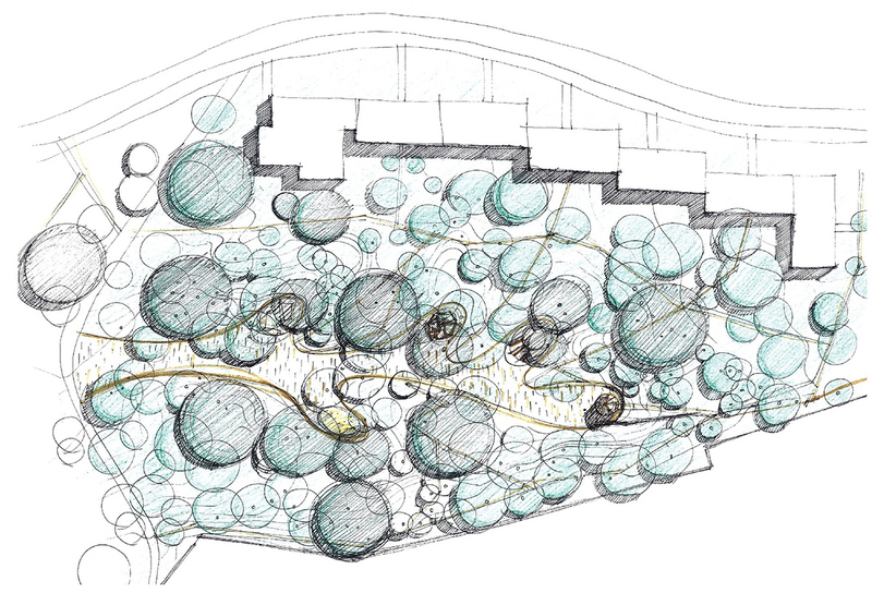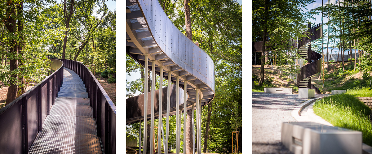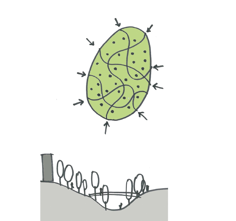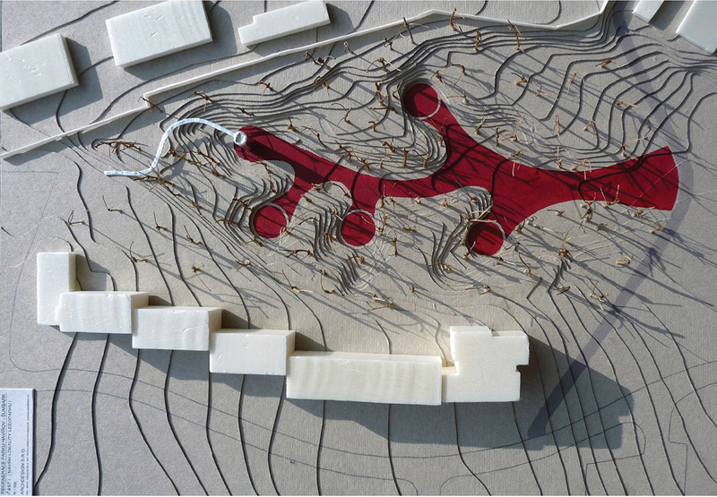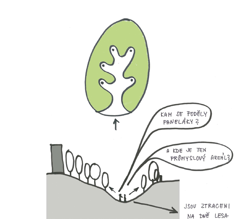 Pro krajinný zásah mezi sídlištěm a průmyslovým areálem bylo vypracováno několik konceptů. Nicméně až na fyzickém modelu zachycujícím členitost terénu jsme si uvědomili krásu přírodou vymodelované rokle. Našim navrhovaným zásahem nebylo nic více, než zpevnění dna rokle tvarovaného kopci a v slepém konci pěšiny byla vztyčená schodišťová věž s lávkou, která umožňuje pokračování cesty v korunách stromů.