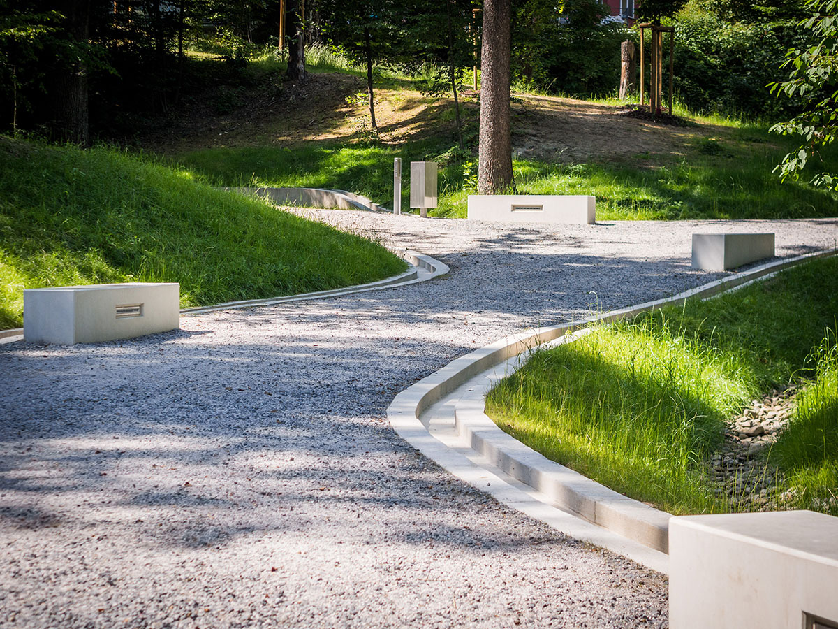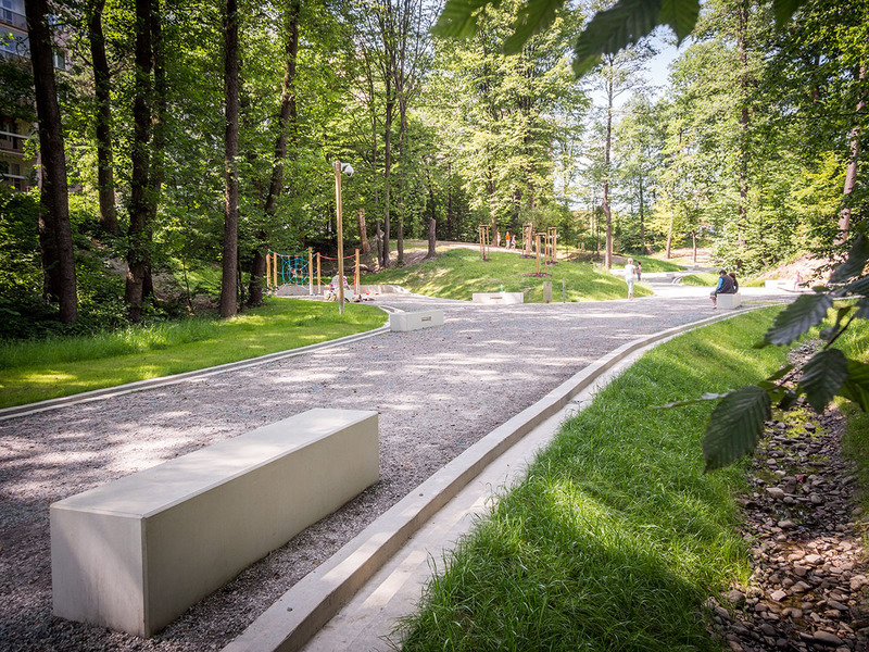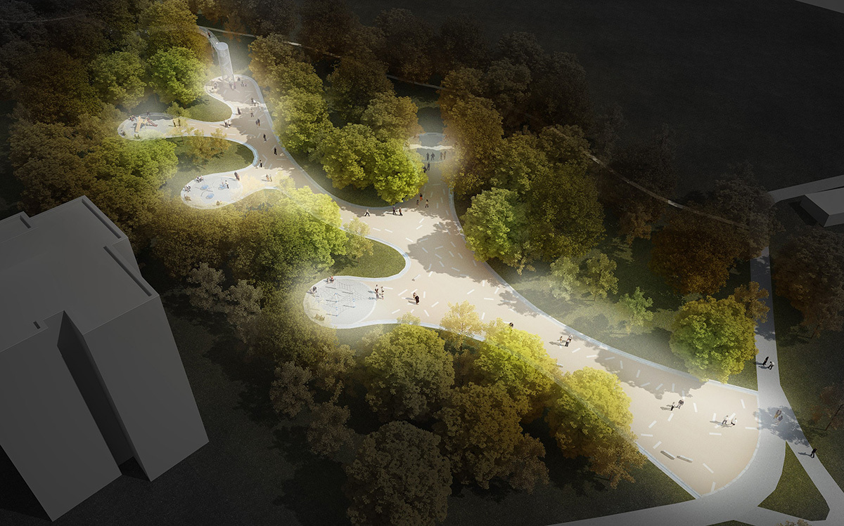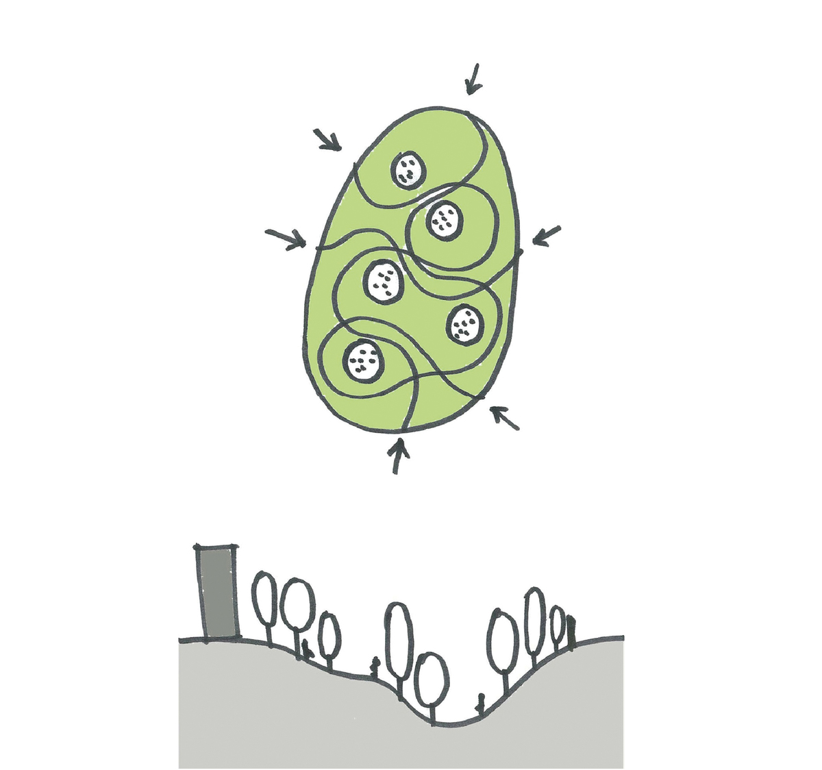Pro krajinný zásah mezi sídlištěm a průmyslovým areálem bylo vypracováno několik konceptů. Nicméně až na fyzickém modelu zachycujícím členitost terénu jsme si uvědomili krásu přírodou vymodelované rokle. Našim navrhovaným zásahem nebylo nic více, než zpevnění dna rokle tvarovaného kopci a v slepém konci pěšiny byla vztyčená schodišťová věž s lávkou, která umožňuje pokračování cesty v korunách stromů.