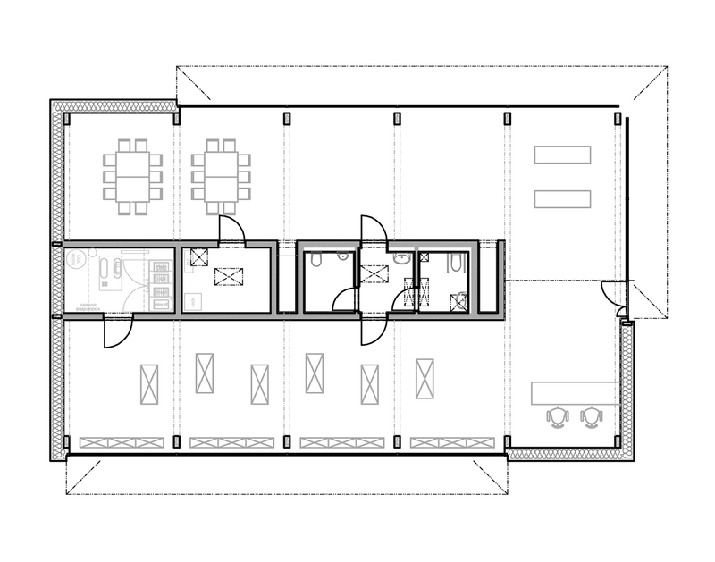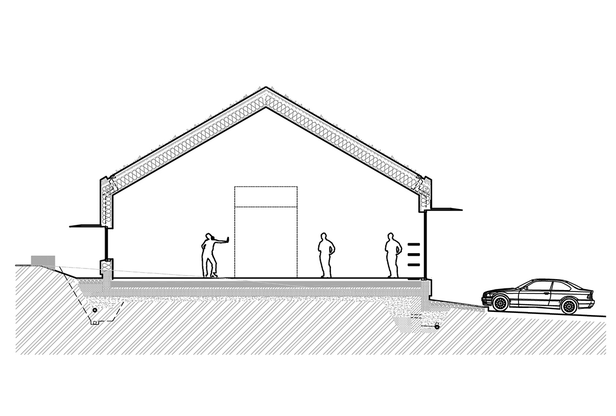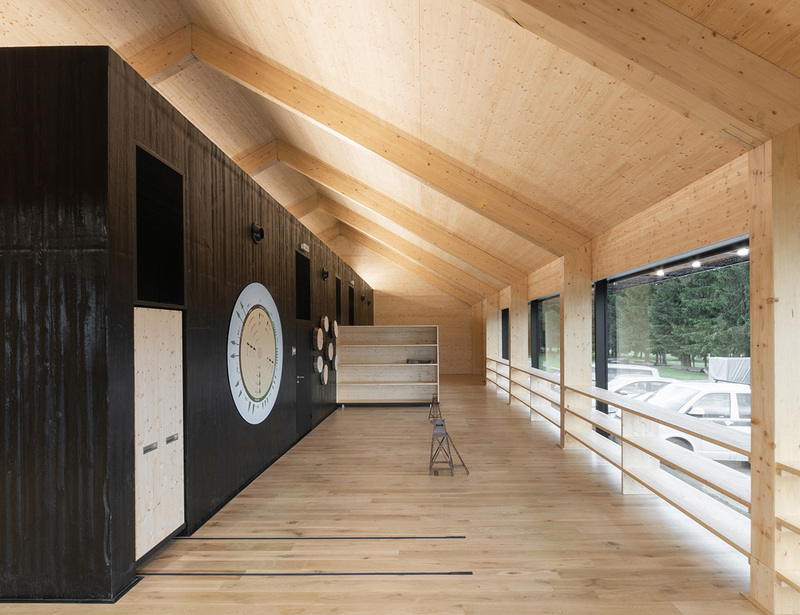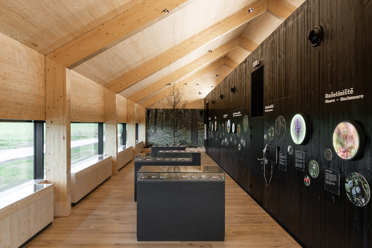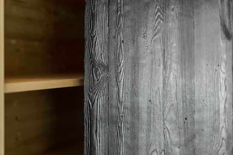 Zároveň betonový kvádr s obtisknutou strukturou svisle kladených dřevěných prken, v sobě ukrývá sociální zázemí, sklady a všechny potřebné technologie vydávající hluk, což díky betonové hmotě je velmi dobře odstíněno. Vložený objekt celý prostor rozděluje na vstupní, výstavní a výukovou část. Stává se jakýmsi sarkofágem umístěným v chrámovém prostoru dřevěné obvodové konstrukce. Při samotném doteku rukou necítíte chladnou podobu betonu, ale máte pocit, že se dotýkáte nějakého plastového odlitku, který má teplotu vnitřního prostoru. Beton se tak stal naprostou součástí celé stavby, nechová se typicky, ale zcela se přizpůsobil samotnému domu, i co se povrchové teploty týče.