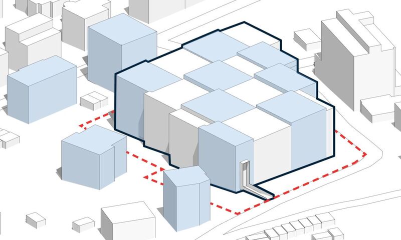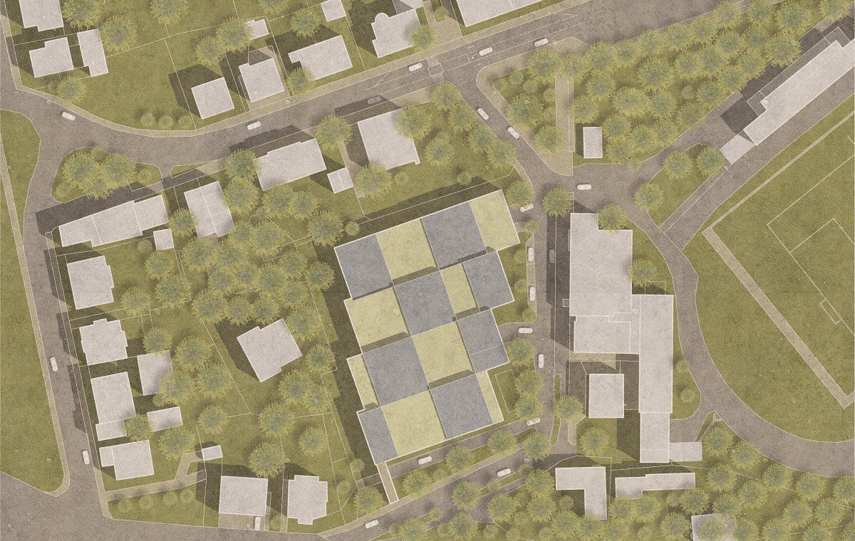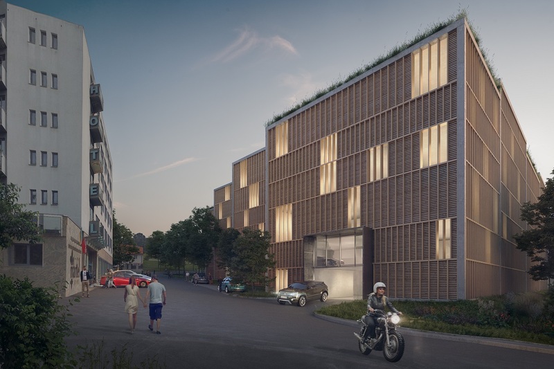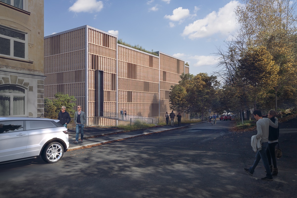 Vyasfaltovanou parkovací plochu v těsné blízkosti obytných domů nahradí členitý objem parkovacího domu pro více než 750 automobilů. Velkou péči jsme věnovali vhodnému přizpůsobení velkého objemu stavby rezidenčnímu charakteru lokality, ve které převládá nízkopodlažní bytová zástavba. Velký objem je při pohledu zvenčí složen z různě vysokých vedle sebe postavených hranolů, což pomáhá stavbu rozčlenit a přizpůsobit měřítku okolní zástavby.