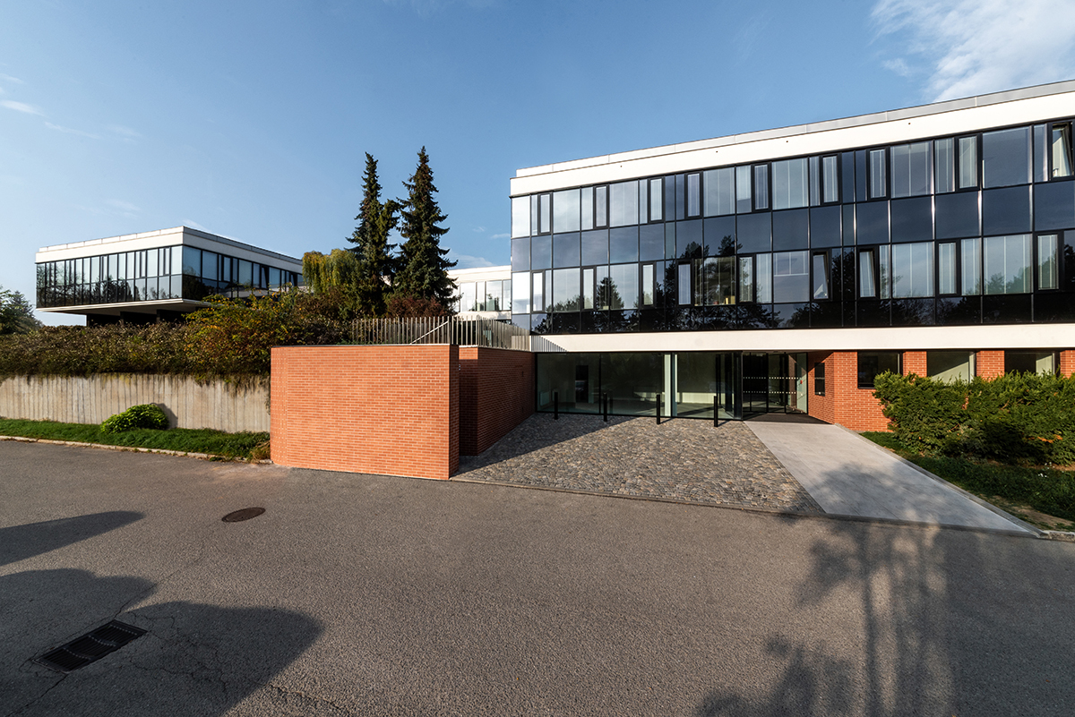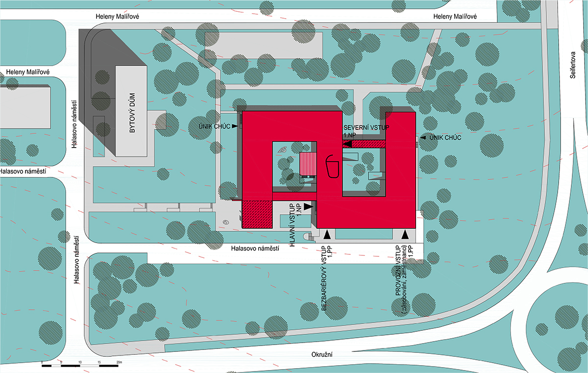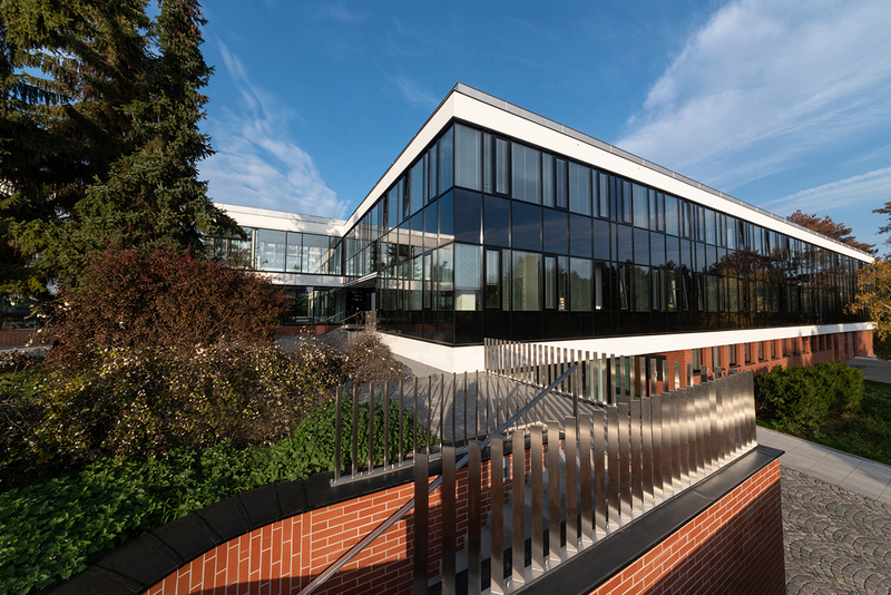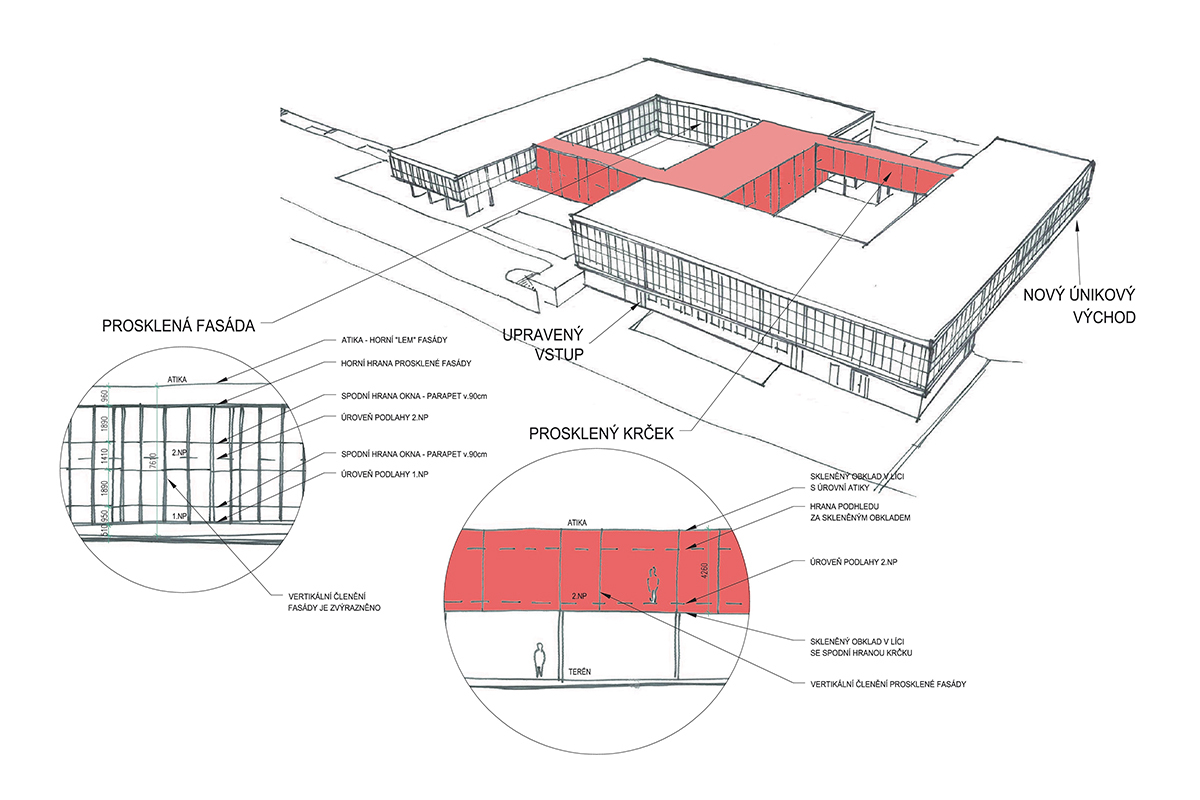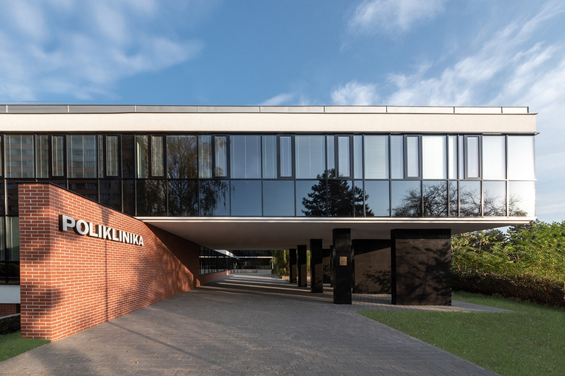 Realizovaná etapa rekonstrukce fasádního pláště respektuje a nově řeší nejen promyšlené návaznosti jednotlivých hmot objektu, ale hlavně atypické členění fasády na cihelný sokl, dva bílé kontrastující horizontální pásy z omítky a výraznou plochu lehkého proskleného pláště. Spojovací krčky jsou v souladu s původním řešením provedeny odlišným systémem velkoformátového zasklení, jehož součástí jsou ventilační křídla důmyslně skrytá v rastru subtilních sloupků fasádního systému. Vybudováním nového proskleného pavilonu umožníme pacientům pochopit půdorysné řešení objektu a spolu s kruhovým zprůchodněním chodeb odstraníme dosavadní systém bludiště. Součástí nového pavilonu bude i centrální box s kompletní nabídkou zázemí pro příchozí osoby včetně vertikálních komunikací. Tato část se stane ústředním bodem, kde bude začínat i končit návštěva polikliniky.