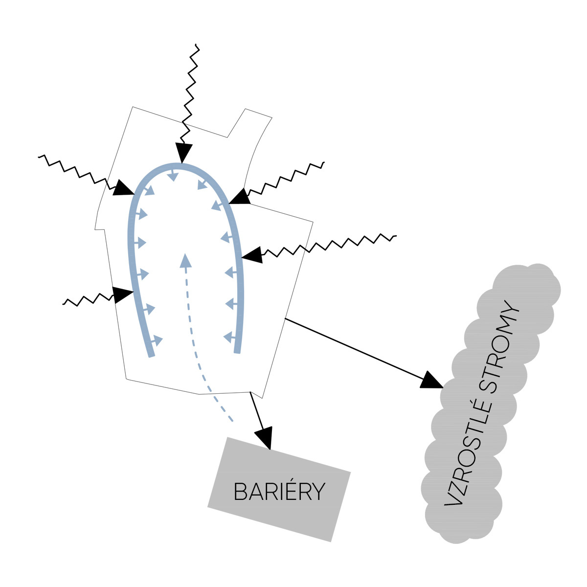 Obyvatelé cestou domů prochází poloveřejným parkem, ve kterém lze také aktivně trávit volný čas. Vysoké dominantní stromy zde vytváří příhodné a zdravé mikroklima, což zároveň brání vzniku tepelného ostrova.