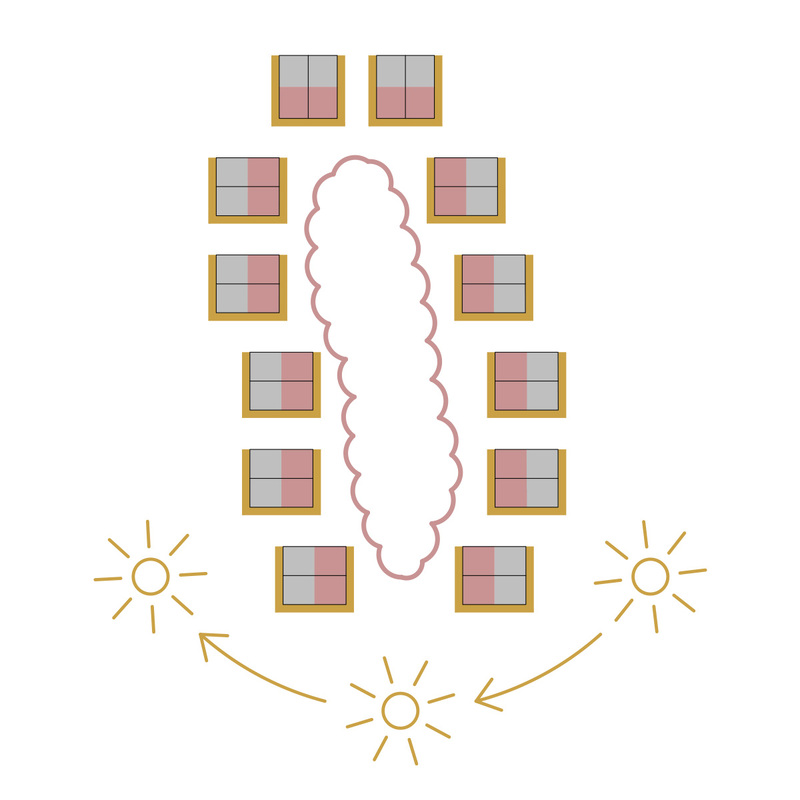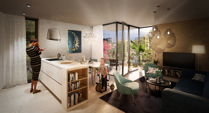 Společenská zóna bytů s promyšlenou dispozicí je v přízemních bytech otočena do soukromé zahrady, čímž je zajištěna maximální míra soukromí i bezpečnosti pro majitele. Ve vyšších podlažích se obytné zóny obracejí do centrálního parku, který poskytuje nadstandardní výhledy a velikou míru soukromí.