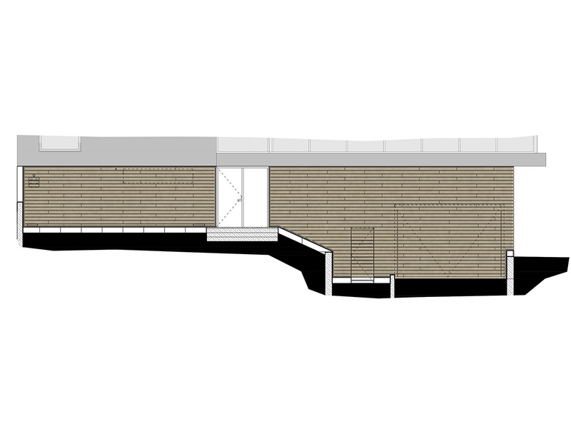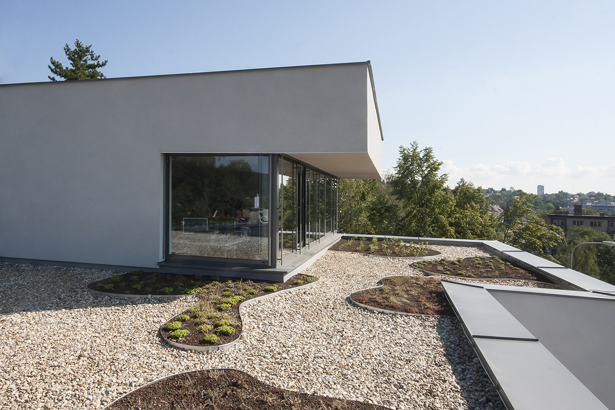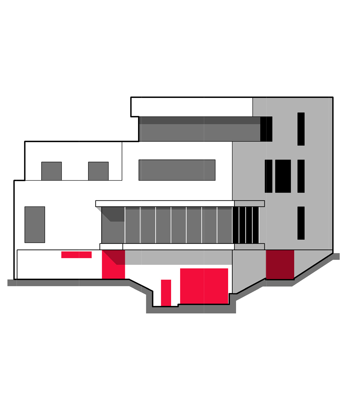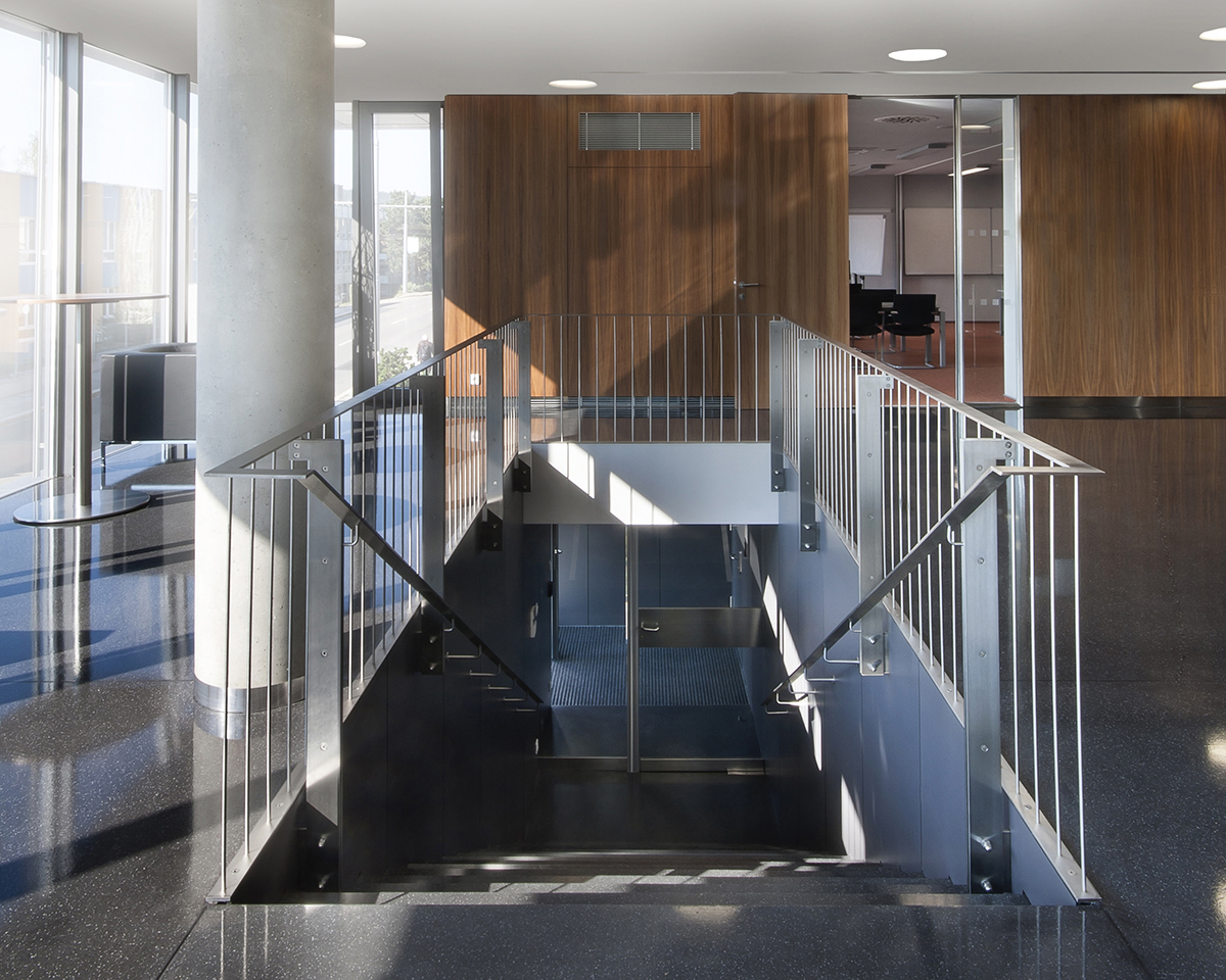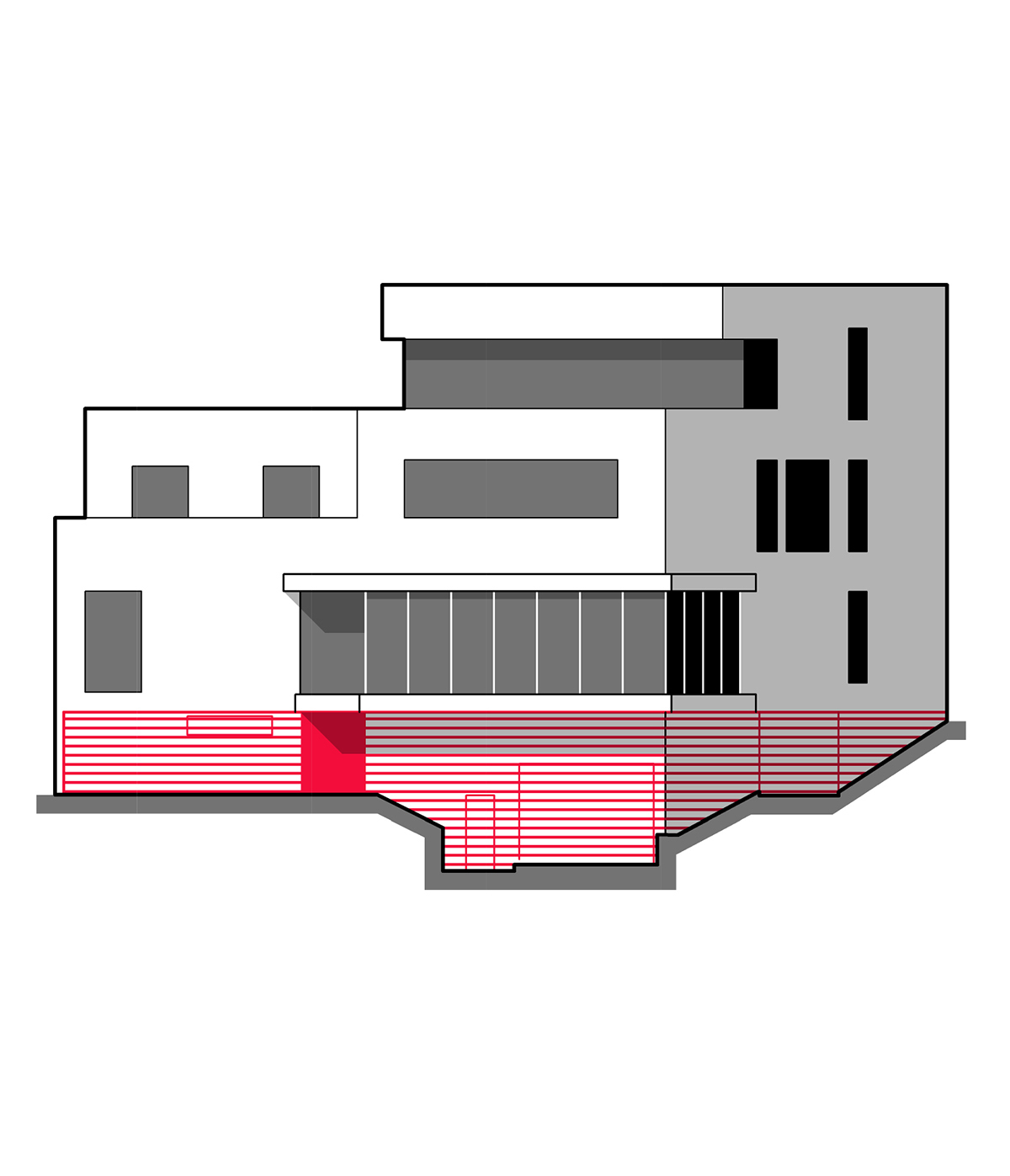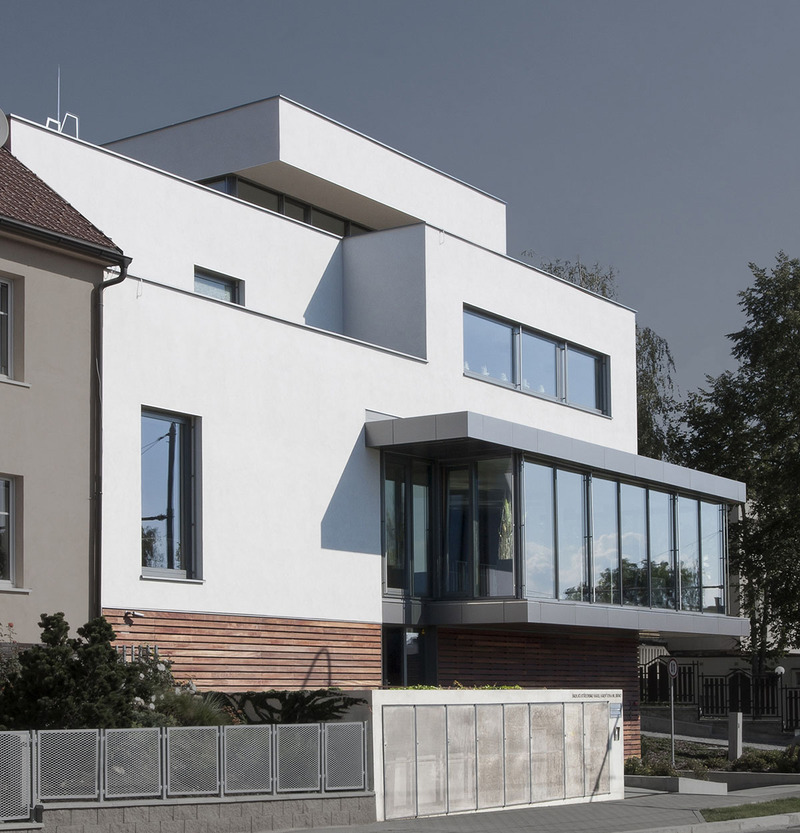 Nejsložitější částí představovaného projektu bylo sjednocení výrazu fasády v soklu, ve kterém se muselo umístit pět různě velkých otvorů (vjezdy do garáží, nasávání, vstupy), navíc ve zcela jiném výškovém osazení. Díky použití roštu z tropické dřeviny Pyinkádo se podařilo čtyři otvory skrýt a přiznat pouze hlavní vstup, který jediný má právo být viditelný.