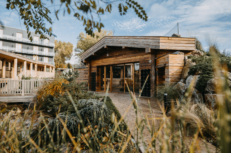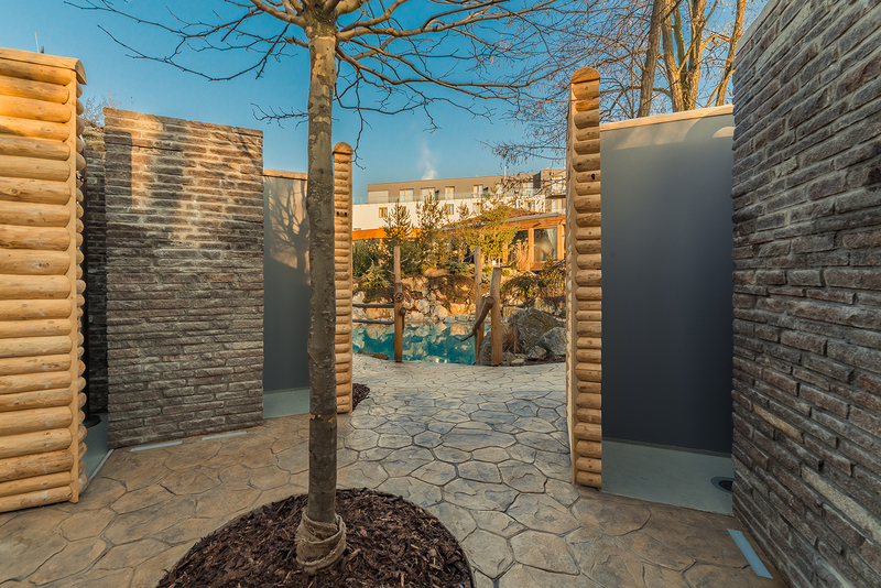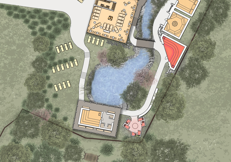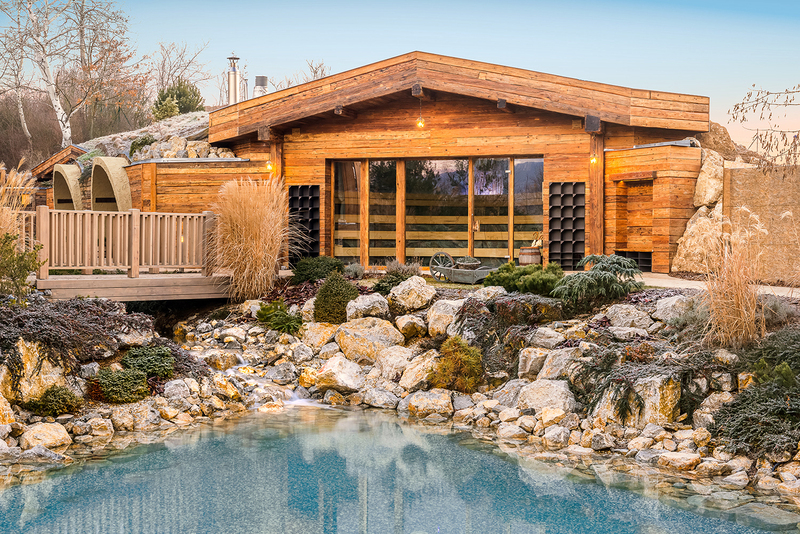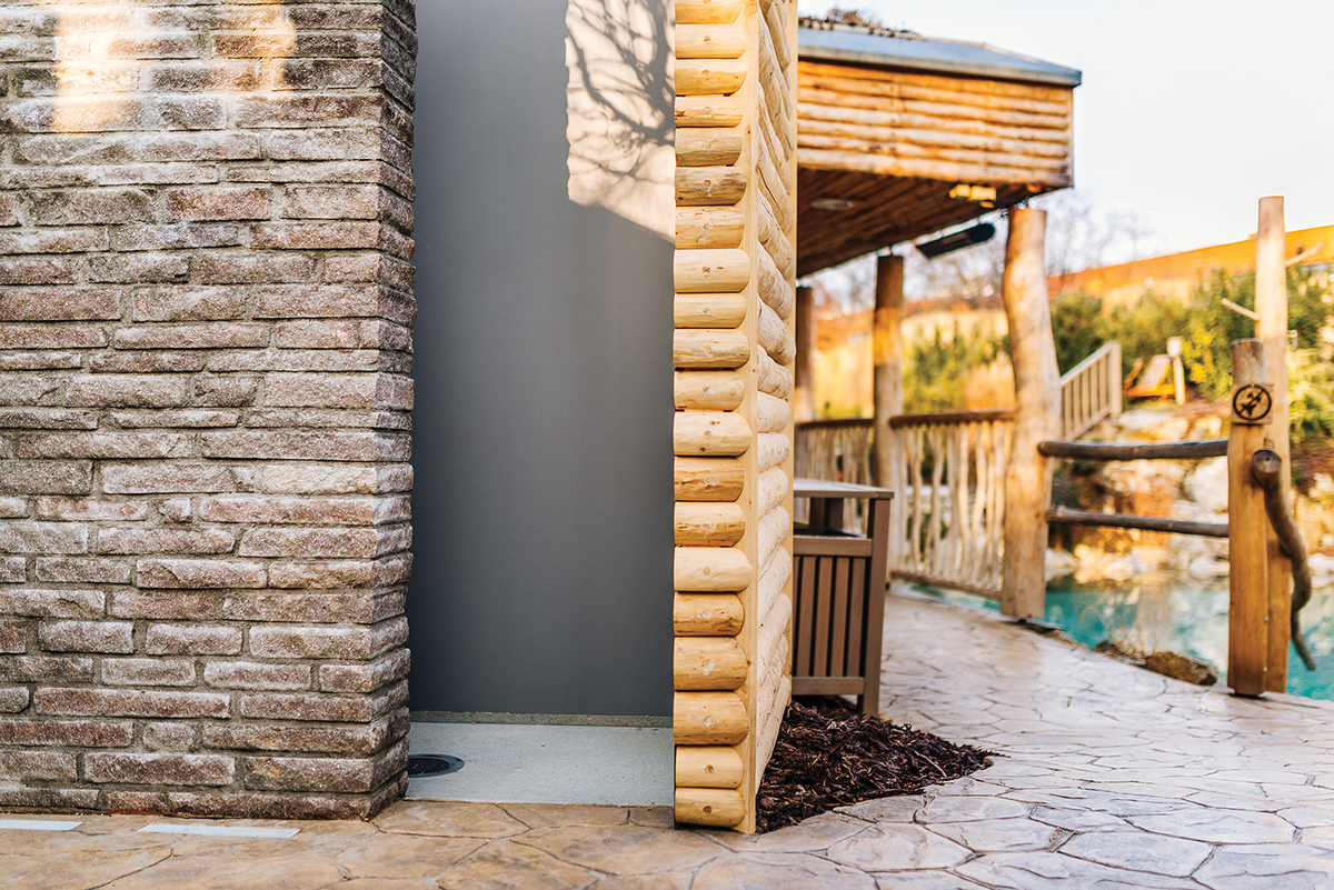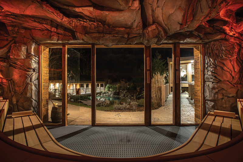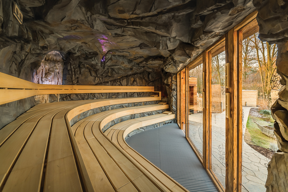 Saunový domek ve stylu, který navazuje na zbytek vesničky, se otevírá velkým oknem směrem k ochlazovacímu jezírku a do okolní přírody. Lidé, kteří si zde právě užívají saunování, tak mají příjemný zážitek rozšířený o pohled na malebné zátiší. Interiér sauny ve stylu jeskyně staví do kontrastu dřevěné lavice s umělým kamenem.