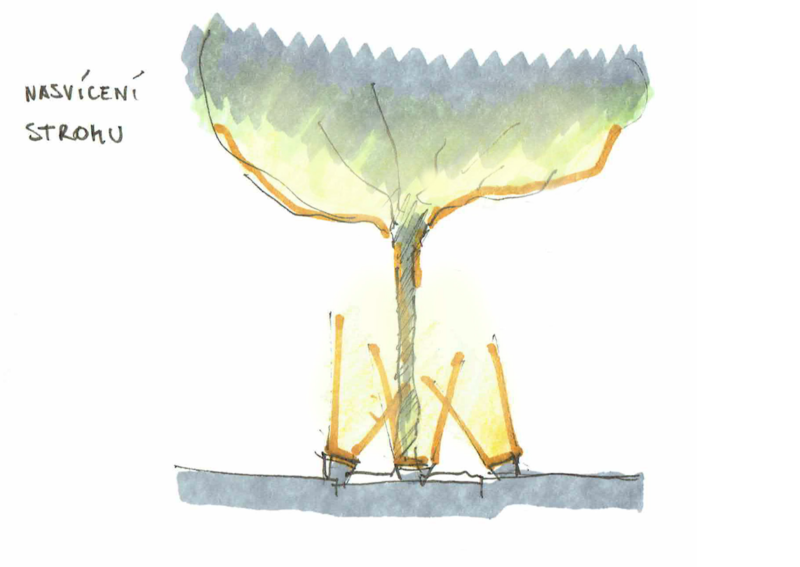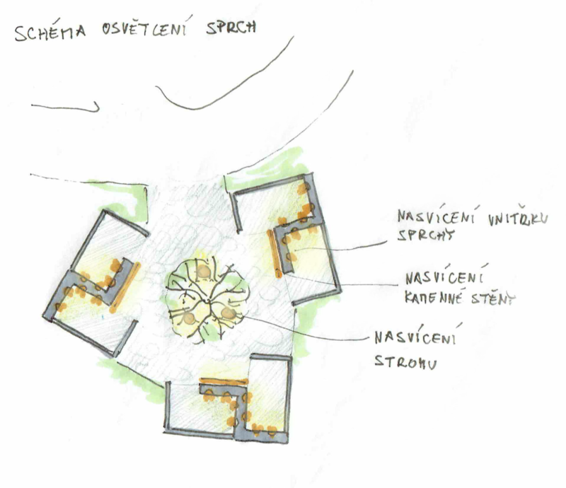Pro zvýšení komfortu ochlazovacího jezírka byly doplněny tři páry venkovních sprch, které jsou uspořádané okolo náměstíčka s nádherně vzrostlým platanem. Sprchy jsou natočeny tak, aby bylo zabráněno nežádoucím pohledům ostatních návštěvníků. Tak je vytvořen intimní prostor pro osobní očistu, který je ve večerních hodinách decentně nasvětlen.